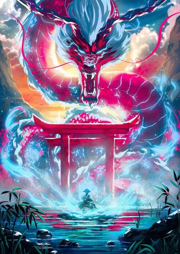 I love exploring Japanese culture, digging through new manga and anime series, and learning new things about Asian mythology. That’s why I decided to go with the theme of the dragon – the spiritual guide for lonely samurais and the guardian of sacred places…Working on this artwork was pure pleasure, and I hope that it emphasizes the mythical creature’s untamed power, strength, and enormity.