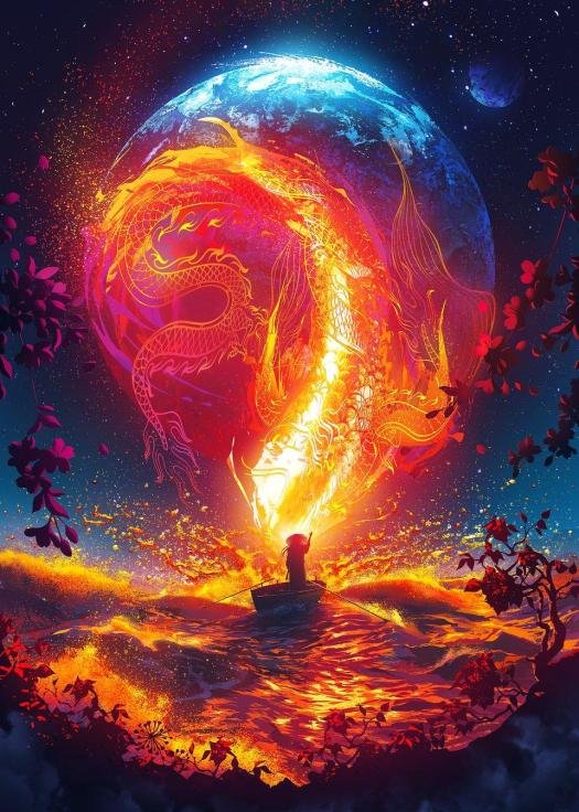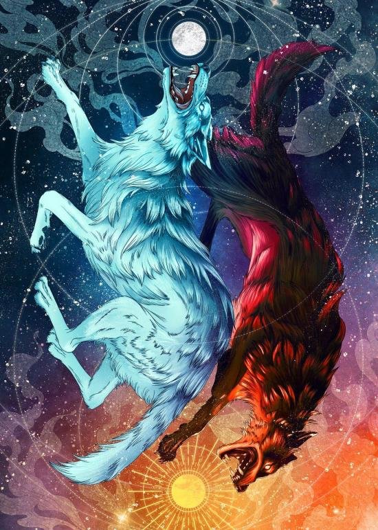 In this piece, Zuzanna Makowska explores the harmony of opposing forces and draws inspiration from the timeless symbolism of wolves and celestial bodies. Through its dynamic composition and a careful use of symbolism, the artwork invites to contemplate the tender equilibrium between light and dark, day and night – a beautifully rendered dance of yin and yang!
