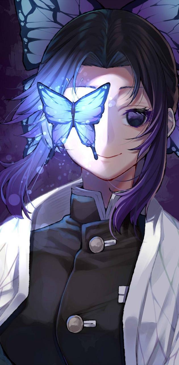 Shinobu apparency wore a neutral look, a smile, and a demeaning expression to indicate that she felt sorry for her opponents. She has a charismatic smile with purple hair highlights matching her cute purple eye globes and butterfly wings.