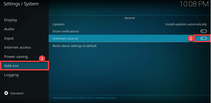 - Click on “Add-ons” and allow “Unknown Sources” for add-ons.