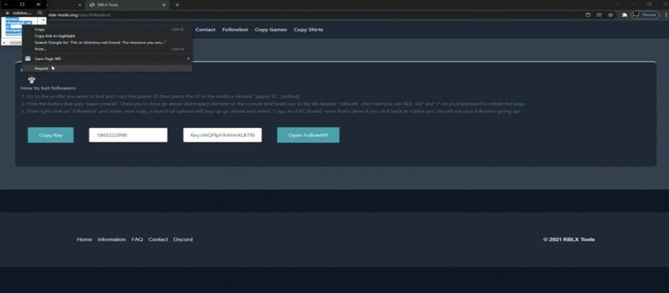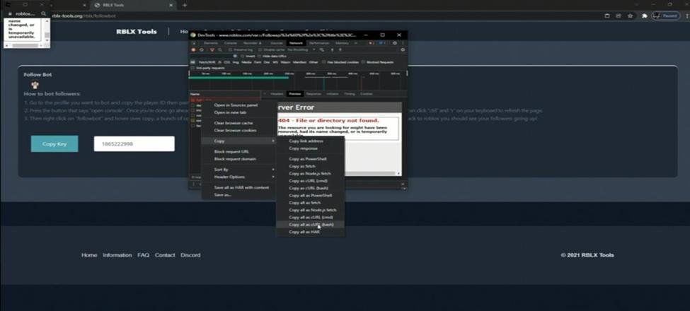 Step 8: Now right-click on the Follower Bot option and hover your cursor to Copy. This will reveal an extra drop-down, then click on where it says to copy all as cURL.